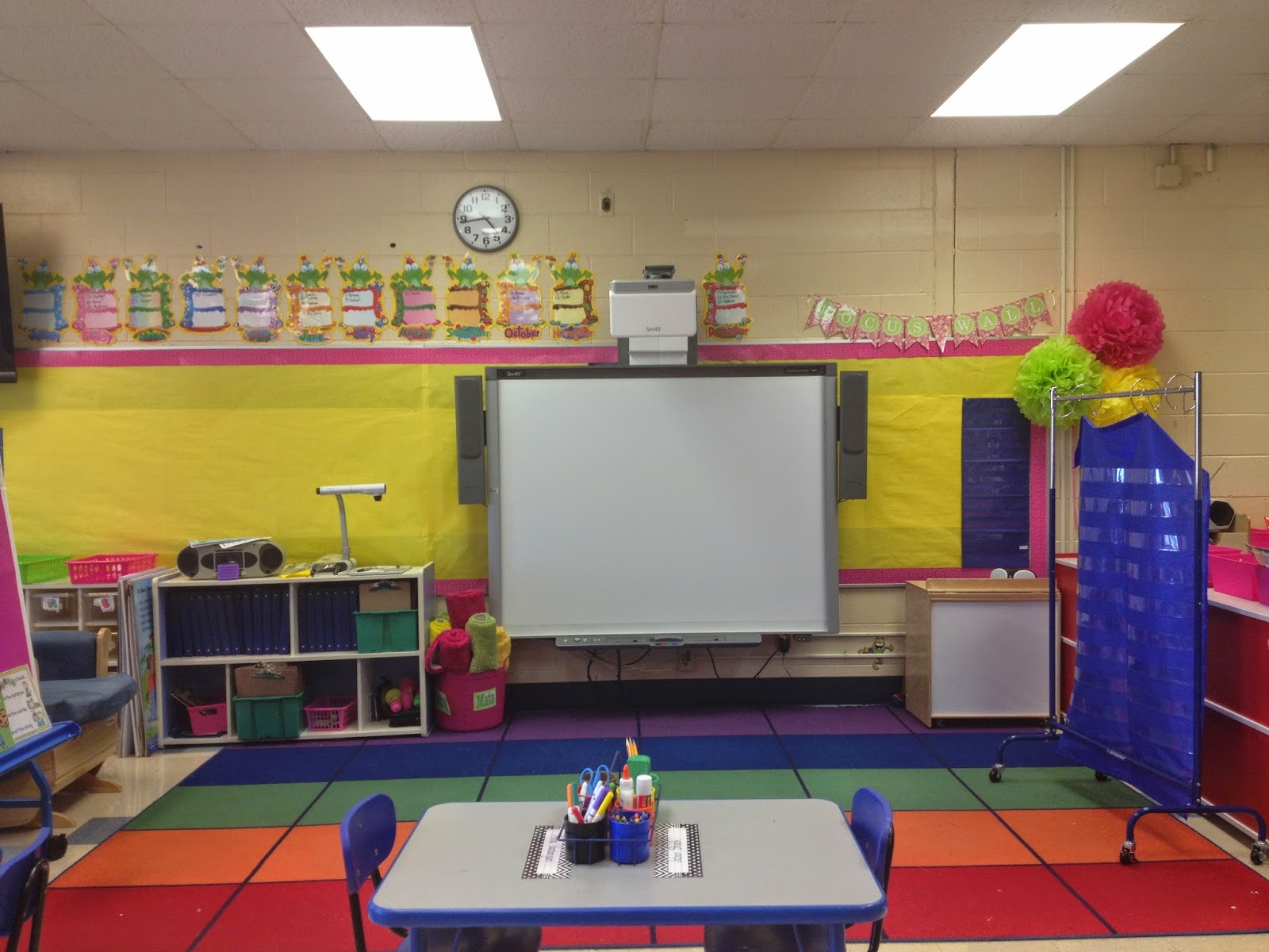 Here is a close up view of my whole group area with my Smart Board. I love it! I don’t know how I ever taught without one, lol! I do not have anything up on the boards yet because this is where I will hang all of my charts.  On the right side will be my Focus Wall. The banner is from Schoolgirl Supply and it says Focus Wall. On the left side is where our Daily 5 charts will go once we create them. On the shelf  is where we keep our calendar notebooks, clipboards, and other supplies we need during whole group. Along the top of the board is our birthday posters. On the floor between the shelf and Smart Board is our Reading Mats. Students can take a Reading Mat (Bath Rug) and place it anywhere in the room to sit on during Read to Self or Read to Someone.