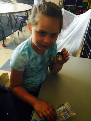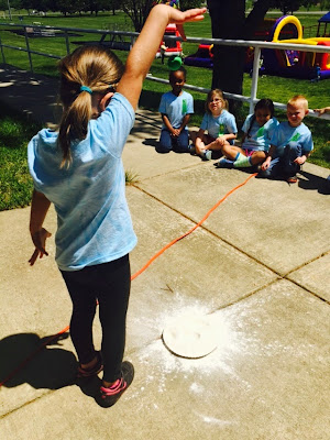 We also learned about how the craters on the moon were formed. Jennifer had the perfect way for us to explore this hands on. We filled a plate with flour (to represent the moon) and had balls (asteroids) crash into the moon to form craters! This was very messy so I thought we would do this one outside. Trying not to get the custodians on my bad side 🙂 This was definitely a hit and helped the concept really sink in.