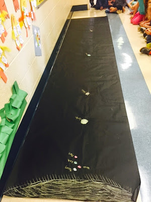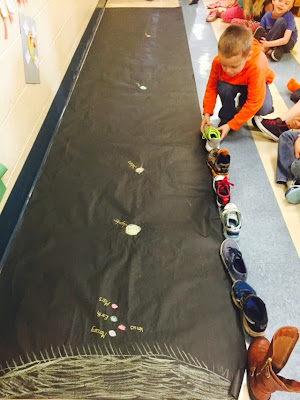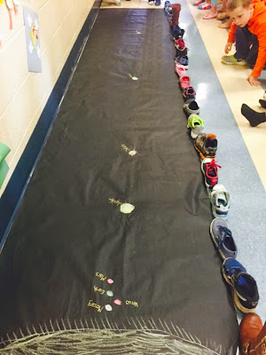 We then worked on our measuring skills. I used DeeDee’s pack for the scale model of the distance between the planets. We talked about the inner planets and the outer planets. We then measured the distance of each planet from the sun with our shoes! Learning is always better when your shoes are off! They were surprised at how far away some of the planets are.