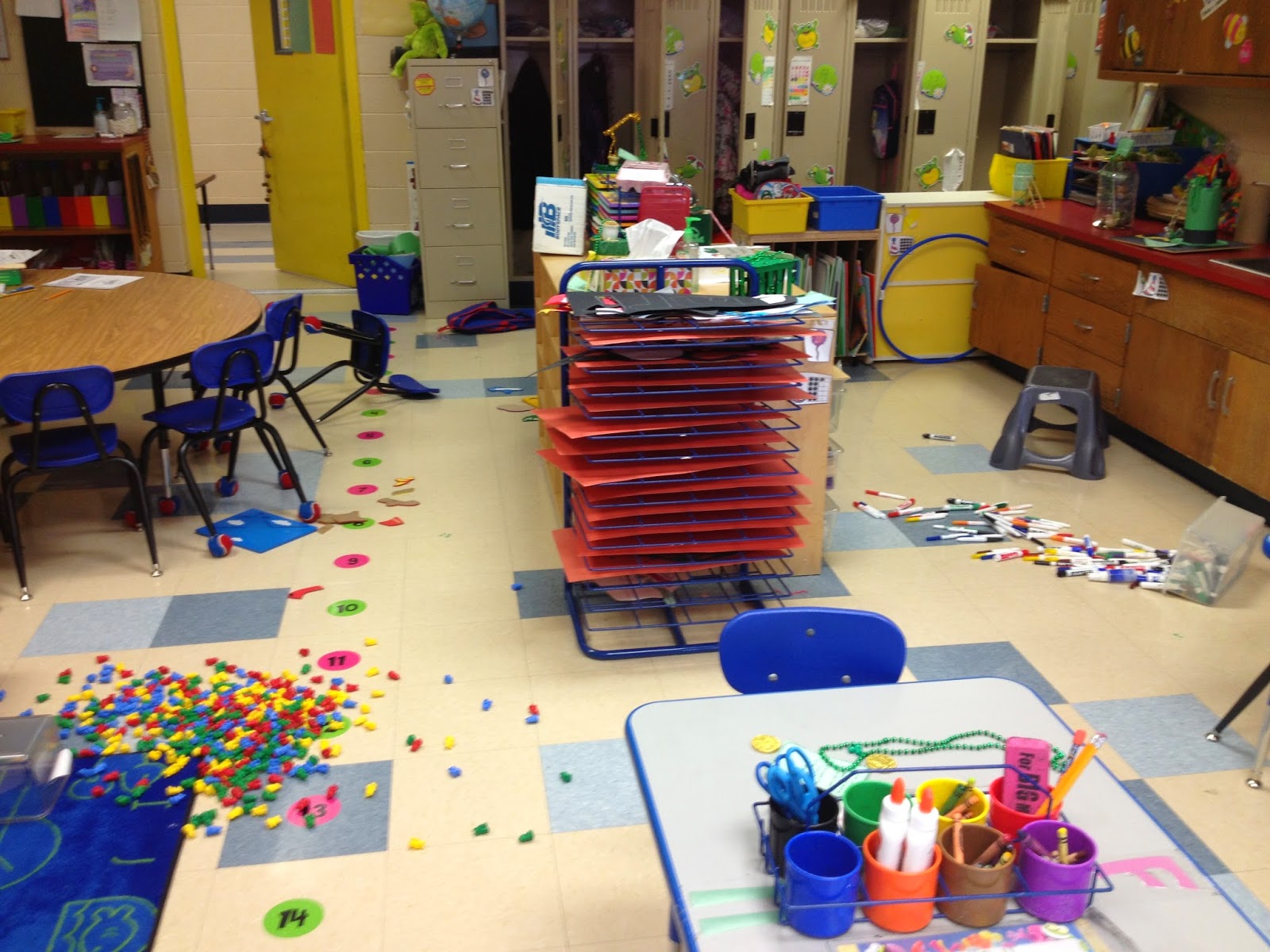 We set up all of the traps so that our room would be safe from those leprechauns. Unfortunately, they still found their way into our room, made it passed all of the traps, and destroyed everything! The kids were so surprised when they came back the next day to find this……