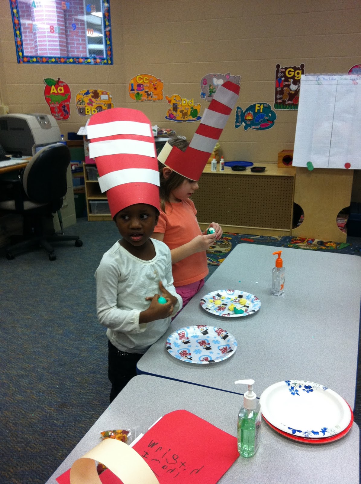Green Eggs and Ham – Seuss Day always requires a little cooking and snacking! We made green eggs and ham for the parents and kids to taste. Then they were able to graph if they liked them or did not. They even got to practice peeling the hard boiled eggs!