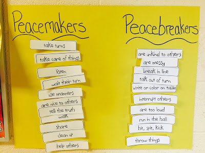 We also discuss Peacemakers and Peacebrakers. We talk about that we always want to be Peacemakers in our classroom and not a Peacebreaker like David was. We then read actions on strips of paper and the students decided if those actions were Peacemakers or Peacbreakers and they glues them in the appropriate column. We leave this poster up all year to remind us to be a Peacemaker!