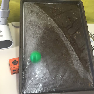 Then it was time for our hands on fun! Penguins love to slide on the ice so we decided to test other objects to see if they would slide on the ice. We made predictions then tested our predictions on the frozen ice baking sheet! They experimented with this until every drop of ice was gone!