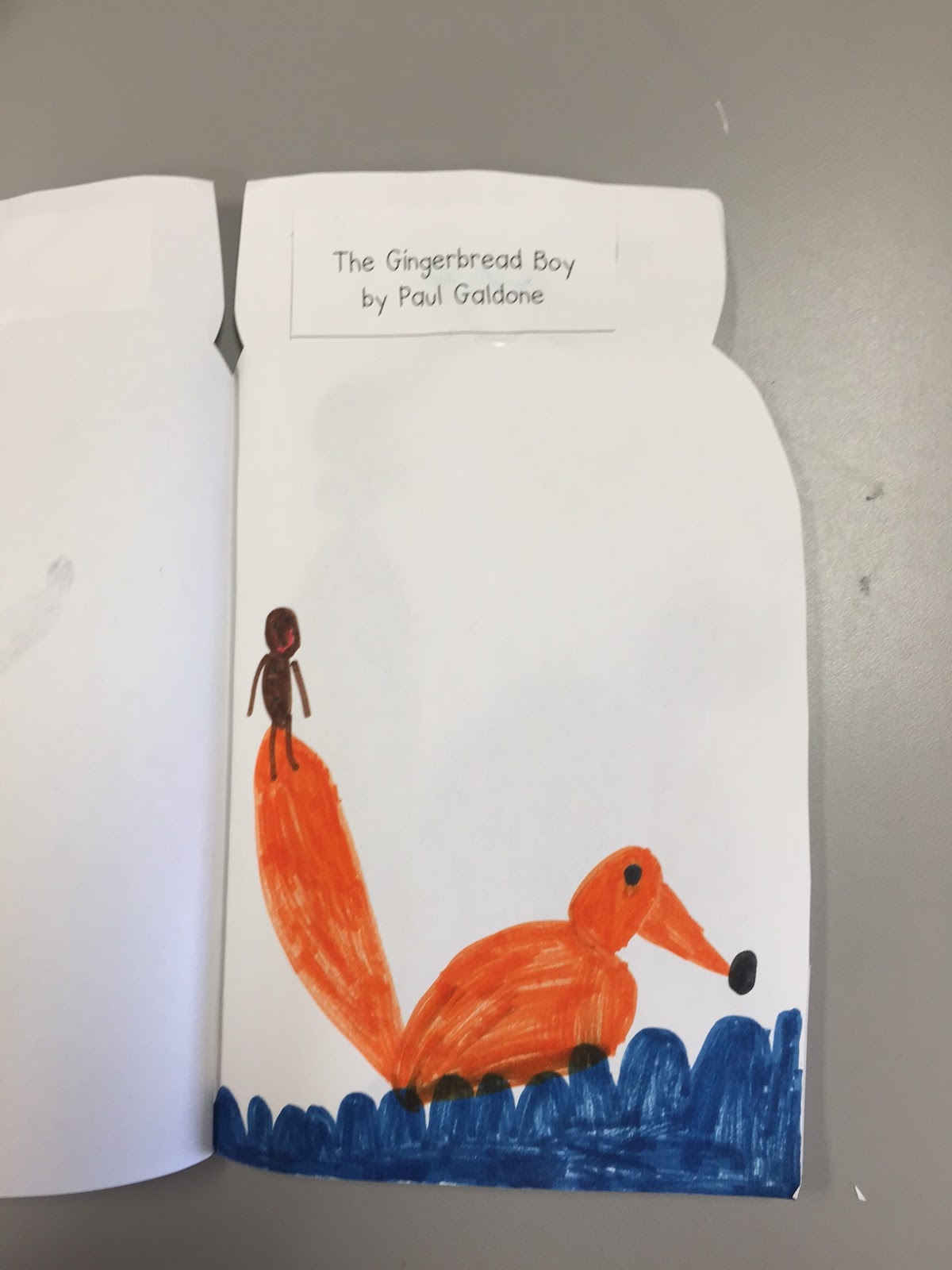 One way that we compare the stories is by drawing and writing about how the story ended. We create our own cookie jar book about each ending of our Gingerbread stories. After we read a story each day, the students will go back and draw what happened to the Gingerbread at the end of each story. I love how creative they are with their drawings! You can also tell that we were practicing speech bubbles during writing 🙂