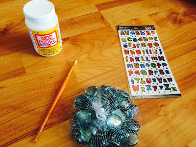 All you need is some small stones, (I got this bag at the Dollar store but you can also find them at Walmart or craft stores too), Mod Podge, letter stickers, and a paintbrush.